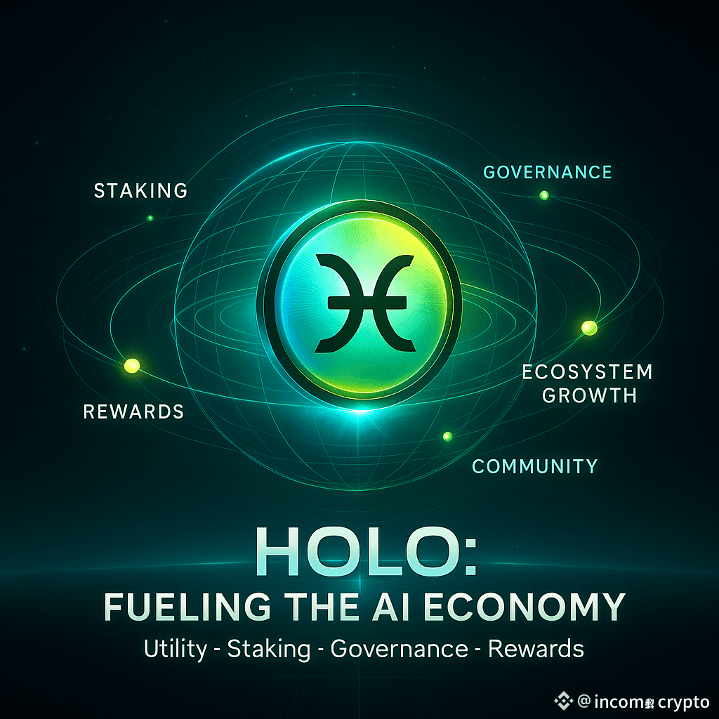 $HOLO Holoworld की मूल इकाई है और यह utility तथा governance दोनों रोल निभाता है। टोकन का मकसद agents के interactions, staking और protocol-level decisions को economically align करना है, ताकि creators, infra providers और users सभी ecosystem में हिस्सा लेकर value capture कर सकें।