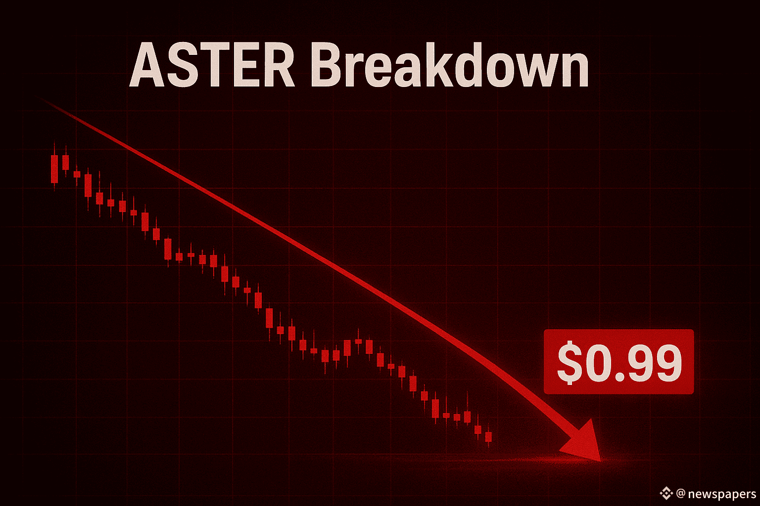 $ASTER has officially slipped into breakdown territory, trading around $0.99, down nearly 10% today and over 30% this week — and the charts say this isn’t just a dip. It’s a full structural failure.