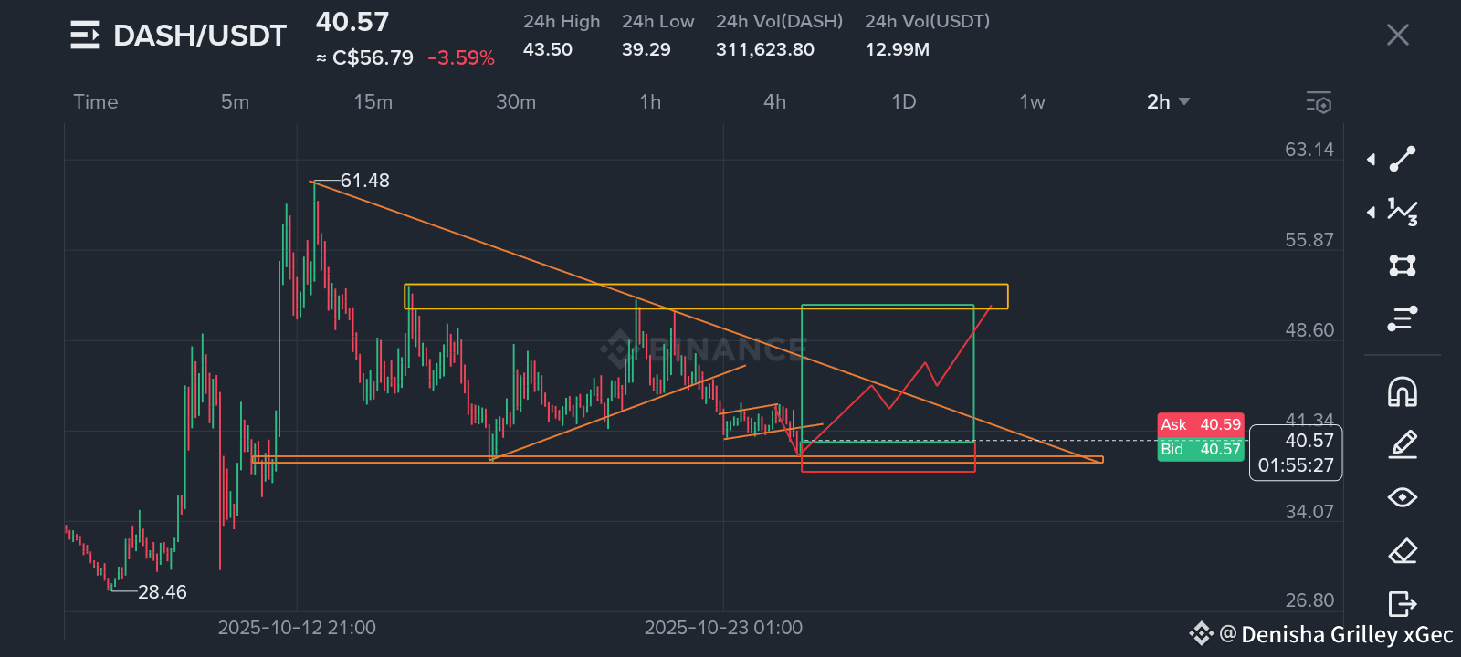 #DASH /USDT is forming a symmetrical triangle pattern and nearing key support around $40 🟠