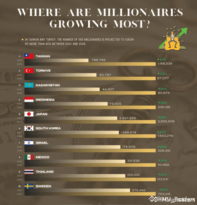 • 🇹🇼 Taiwan (Highest Growth): Projected to reach 1,158,239 millionaires by 2028. This sharp rise is driven by its rapidly growing technology sector, particularly its world-leading role in semiconductor manufacturing (TSMC), which powers AI, phones, and cars. Stable financial systems also contribute.