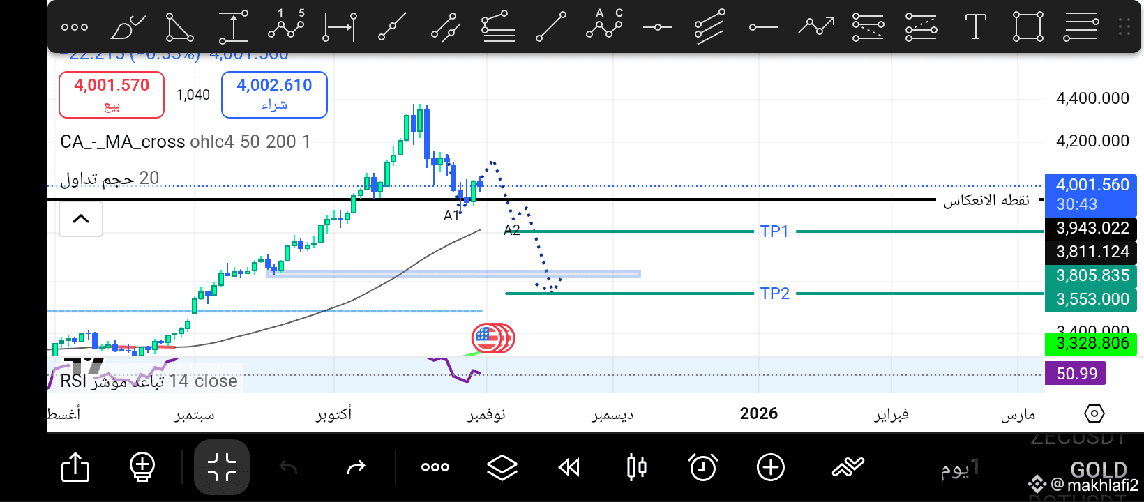 2. Gold then retraced upward to form a new swing high, potentially preparing for A2.
