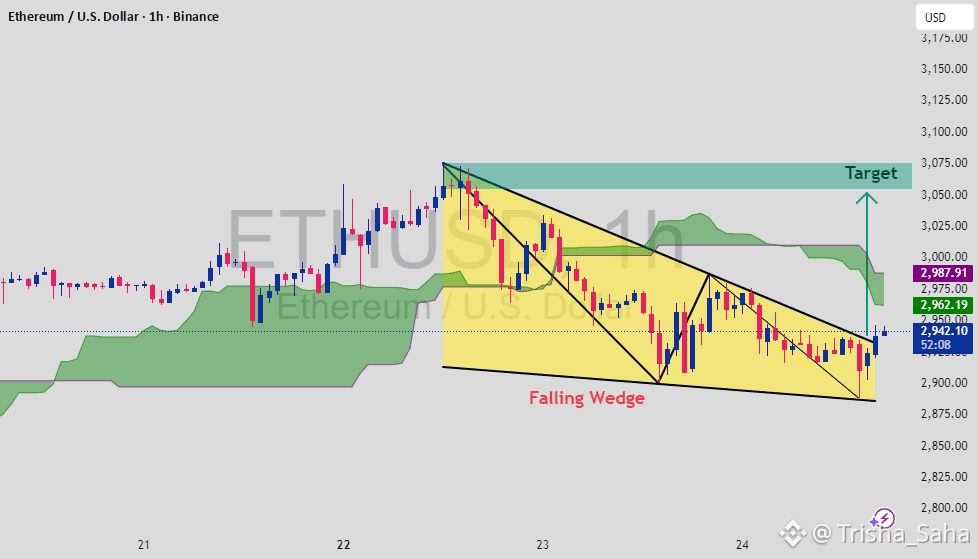 Ethereum is trading inside a well-defined falling wedge pattern, which is typically a bullish reversal / continuation structure after a corrective move. Price is currently stabilizing near the lower boundary of the wedge while holding above key support around 2950, suggesting selling pressure is weakening.
