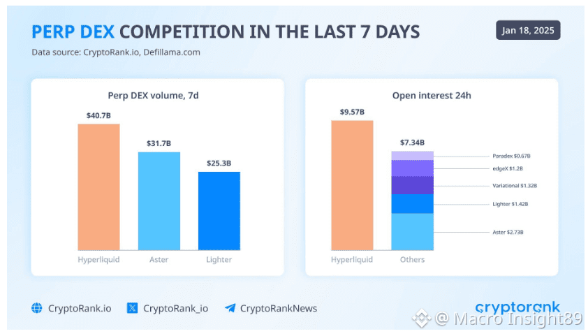 Hyperliquid đã trở lại ngôi đầu trong số các Perp DEX. Dữ liệu từ CryptoRank cho thấy Hyperliquid ghi nhận khoảng 40,7 tỷ USD khối lượng giao dịch trong tuần qua. Aster đứng thứ hai với 31,7 tỷ USD, trong khi Lighter tụt xuống vị trí thứ ba với 25,3 tỷ USD.
