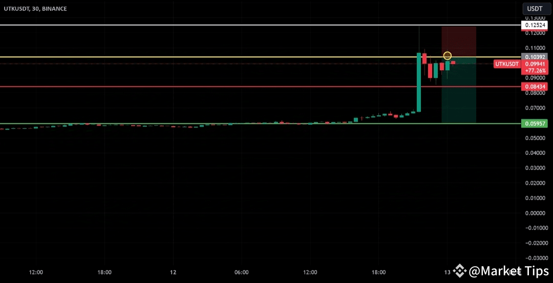 UTK/USDT is showing a bearish setup after rejection at resistance. Entry at $0.10392, targeting $0.0834 (Target 1) and $0.05957 (Target 2), with a stop loss at $0.12524 for a strong risk-reward ratio. Monitoring for continued downward momentum and volume confirmation.