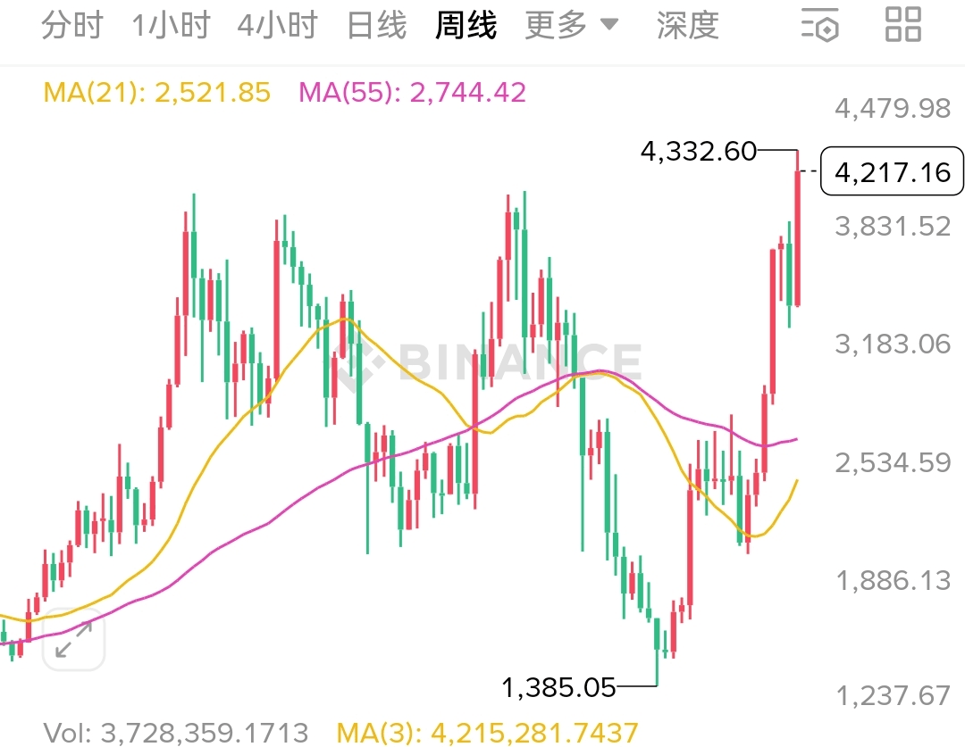 $ETH From the weekly chart, it has reached 4332.60, a high point in recent years. The space has opened up, and a pullback is a buying opportunity. The ideal entry point is the daily 21 line; I hope there will be an opportunity, 4000.00 is also acceptable. The judgment should be high-level oscillation, then continue to attack; we don't need to think about cheap chips.#ETH走势分析