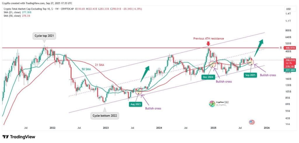 Altcoin sentiment has soured across social platforms, yet market structure data tells a different story. According to analyst CryptoFlow, the Crypto Total Market Cap excluding the top 10 assets, commonly referenced as $OTHERS, has formed another bullish crossover between the 21 week and 50 week simple moving averages.
