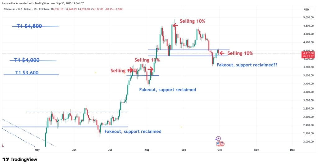 According to IncomeSharks, the asset has repeatedly dipped under key supports before rapidly recovering, forming what they describe as “fakeouts” that trap bearish traders. These rebounds have reinforced confidence among buyers, yet the question remains whether the current attempt to reclaim $4,000 will finally stick.