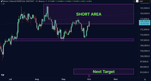 Bitcoin’s upward momentum began in early July near $100,000. Prices surged rapidly, reaching peaks around $113,000 before hitting resistance. Additionally, trading activity through August and September consolidated between $107,500 and $115,000, confirming repeated tests of support and resistance. Consequently, analysts now view $115,000 to $120,000 as a “short region,” marked on Doctor Profit’s chart.