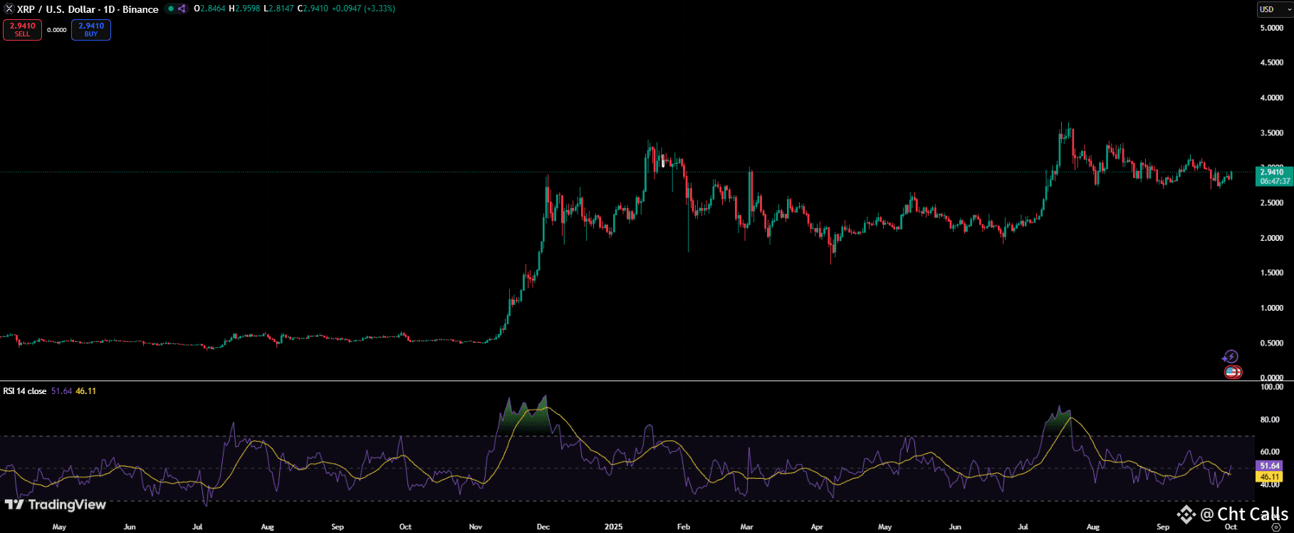 The daily chart also paints a constructive picture. While XRP has been consolidating after strong rallies earlier this year, the Relative Strength Index (RSI) is hovering around 51 – a neutral zone that leaves room for further volatility. If momentum builds, traders expect a breakout above $3 could invite additional bullish pressure.