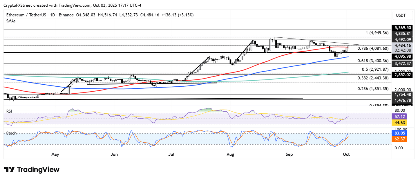 Ethereum Price Forecast: Ethereum tests $4500 resistance after surpassing the 50-day simple moving average