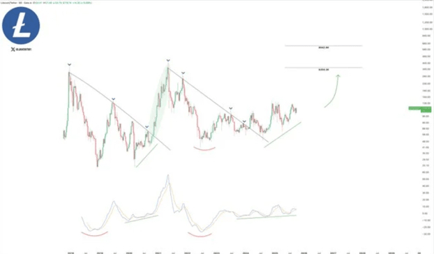 The famous analyst Javon Marks indicated that the formation of Litecoin resembles previous highs. He set a potential long-term target at $354, with a higher expectation that could reach $842, if momentum continues according to past patterns.