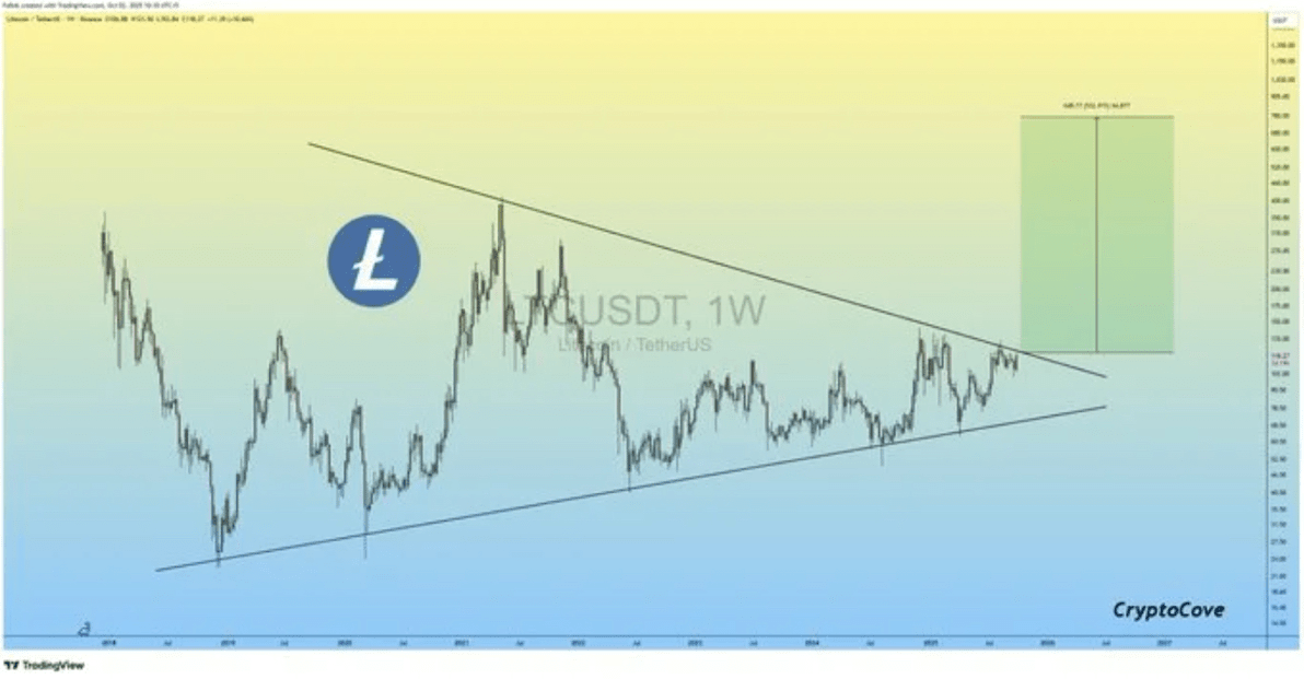 Analyst Captain Faibik provided insight into the weekly chart, pointing to a symmetrical triangle narrowing since 2018. He explained that a confirmed breakout could push LTC towards $648. Both analysts confirm that the current breakout price of Litecoin could be the beginning of a much larger upward wave.