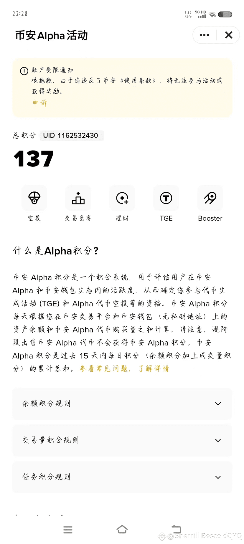 如果没有工作室利用脚本去稳定币的价格那些手动去刷交易量的人心里不慌吗?随便夹一下抢一个月的空投都弥补不了被夹的损失,打击工作室对我们所有人并没有好处,项目方上币看到没有交易量我们连薅羊毛的机会都没有,同样币安也赚不到刷交易量的手续费。新增的币安用户大多数都是工作室开发,这不仅仅给币安交易所带来流量同时让更多人走进加密货币行业,每一份报酬的背后都付出了别人看不到的辛酸和汗水,空投奖励都是要个人来完成,所有人凭手速来获取奖励,Alpha活动是公平的,我建议币安取消封控,增强抢空投人脸识别,每次风险验证必须人脸识别,让每个人都公平参与获得奖励,避免外挂和脚本来获取空投奖励。如果封控存在,流失的用户只会越来越多。