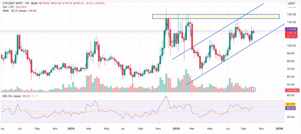 The medium-term trend for Litecoin remains upward, supported by the ascending trendline near $100. This level has consistently acted as a base, confirming buyers’ presence at lower levels. However, analysts caution that a rejection from the current resistance area could form a bearish double-top pattern on the weekly chart. If confirmed, this technical setup could pressure the market toward lower price zones, ending the recent phase of stability.