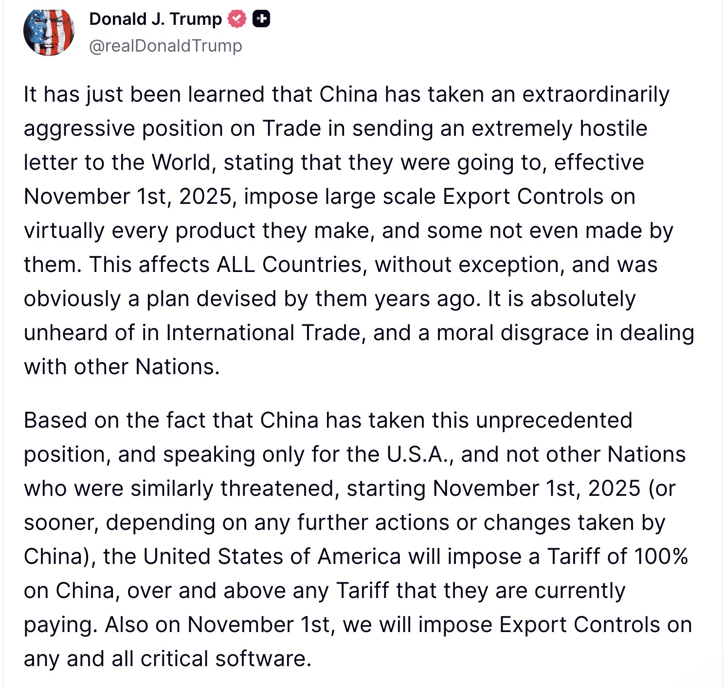 Trump made a statement on Truth Social on October 10, threatening to impose 'huge tariffs' on Chinese goods entering the U.S., and later confirmed that the tariff rate would be raised to 100%.