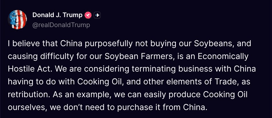 2. American products are simply MORE EXPENSIVE right now. - The average price of American soybeans is $520 per ton, while Brazil and Argentina sell the same amount for around $430, a clear difference of $90. Likewise, American cooking oil costs between $1.45 and $1.60 per liter, compared to $0.90 and $1.10 from Asian suppliers.