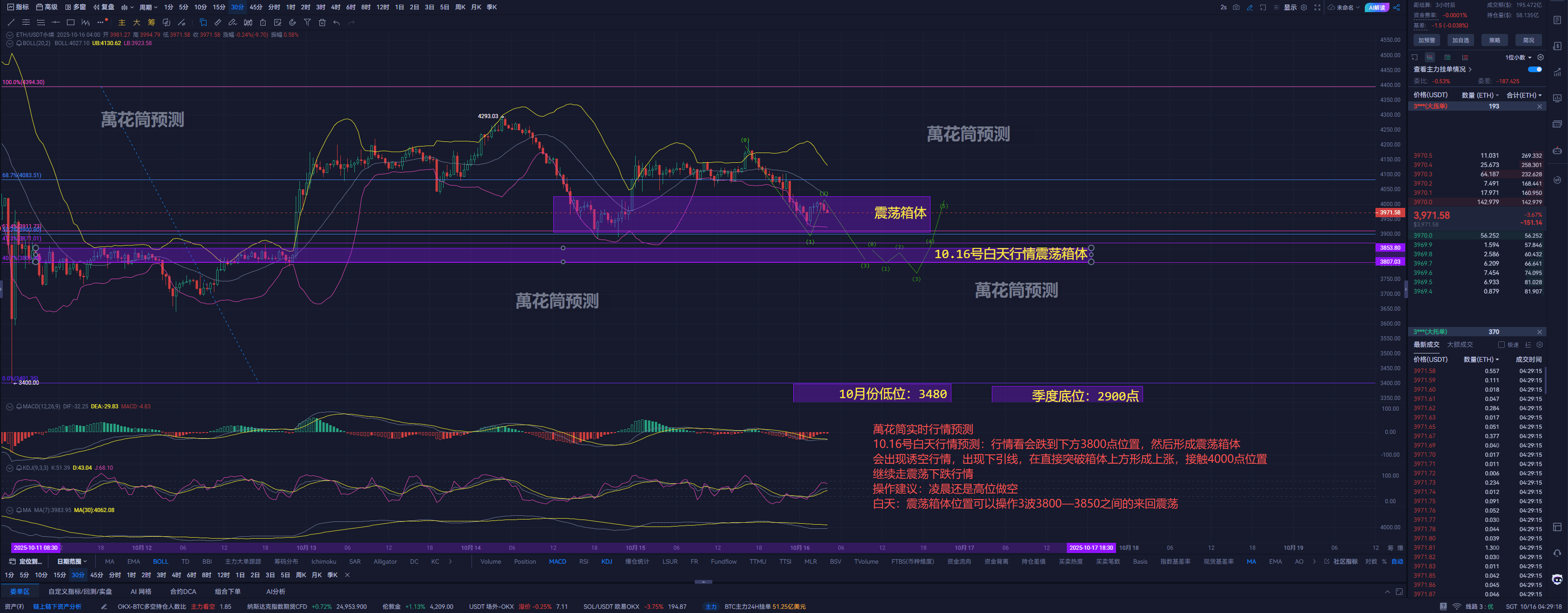 Kaleidoscope early morning real-time market prediction for October 16th: The market is expected to drop to the lower position of 3800 points, then form a consolidation box with a false short market appearing, followed by a lower shadow, directly breaking through the upper side of the box to form an upward trend, touching the 4000-point position and continuing to experience a fluctuating downward trend.