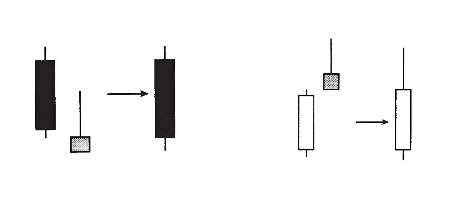 The Inverted Hammer pattern can be simplified to a large bearish candle (see the left side of the diagram below). If only considering the simplified figure, it will certainly have a bearish tendency; the Shooting Star pattern can be simplified to a large bullish candle (see the right side of the diagram below). If only considering the simplified figure, it will certainly have a bullish tendency. At this point, we find that the restored candle chart patterns contradict their original meanings, so in practical application, we need to combine with the subsequent market trends for further confirmation. (pp.44-45)