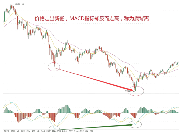 (2) Bottom divergence: Prices fall while the MACD indicator rises.