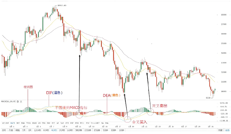 MACD consists of the blue line DIF, the yellow line DEA, and the histogram. With the zero axis as the central axis, above 0 indicates strength and below 0 indicates weakness. When the blue line crosses above the yellow line, it is a golden cross; when the blue line crosses below the yellow line, it is a death cross.