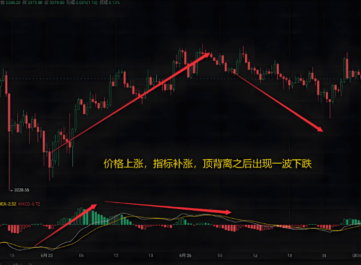 In actual operations, it is often summarized as escaping the top and buying the bottom. Sell at top divergence and buy at bottom divergence. In a rising market, prices continuously hit new highs, and moving averages are perfectly aligned in a bullish arrangement. If only looking at price and moving averages, it seems that the upward trend has not yet reached its end. However, after multiple waves, it seems that some changes occur. The MACD top divergence often reminds everyone that such a trend might end at any time.