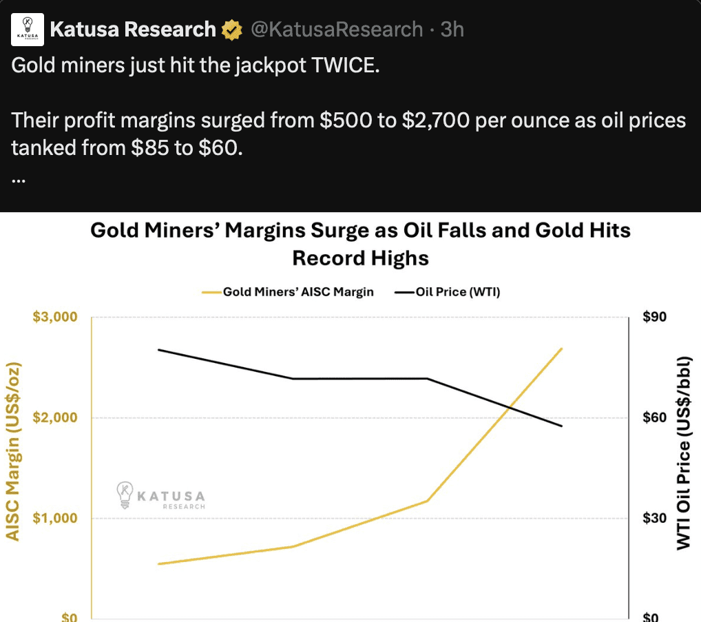 For miners, this configuration has become a gold rush of profits. Their total maintenance cost, which covers everything from mining and refining to maintenance and overhead, has remained stable around $1,200-$1,400 per ounce. Since energy accounts for approximately 20-30% of that, the drop in oil reduced another $100-$150 per ounce in expenses. Thus, when gold prices soared more than 70% while costs barely moved, margins skyrocketed from about $500 per ounce to over $2,700. That is the kind of differential that is rarely seen in mining history.