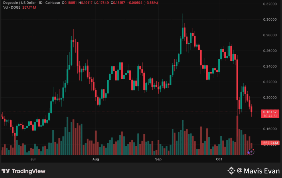 Dogecoin once danced like sunlight on water light, playful, unstoppable. But today, the waves are colder. The meme-born giant that once ran on laughter and loyalty has stumbled, slipping 10% to $0.17. Behind the curtain of green and red candles, the story is more human than it looks a story of faith tested, and a movement trying to find its heartbeat again.