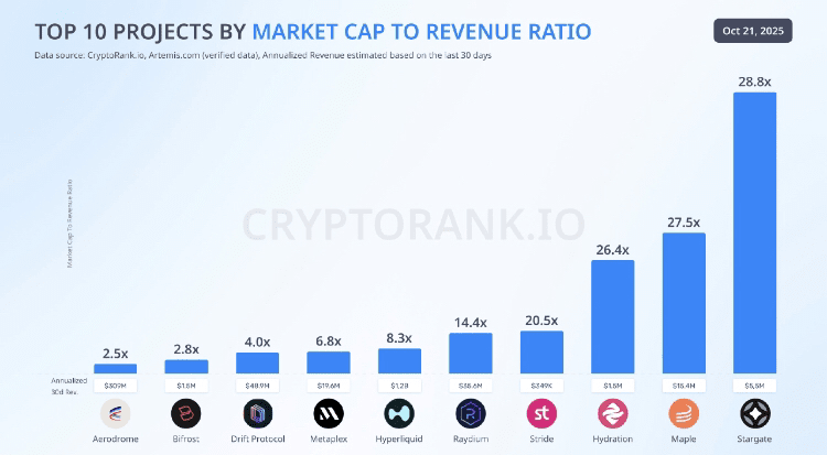 * Projects in the lower half like Raydium (14.4x), Stride (20.5x), and Stargate Finance (28.8x) are still considered good when compared to many traditional companies, but they require more revenue growth to reduce the ratio and match the efficiency at the top.