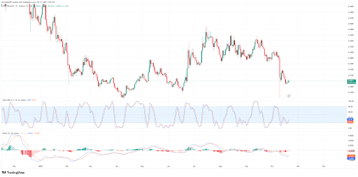 Stochastic RSI shows early bullish momentum while MACD remains neutral, indicating a possible short-term recovery if $0.22–$0.23 is reclaimed.