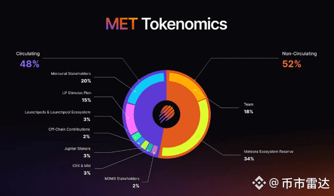 代币分配:社区与生态系统(包括流动性激励、空投等)是核心,占比48%(TGE时即流通)。团队分配18%,Meteora储备金占34%。