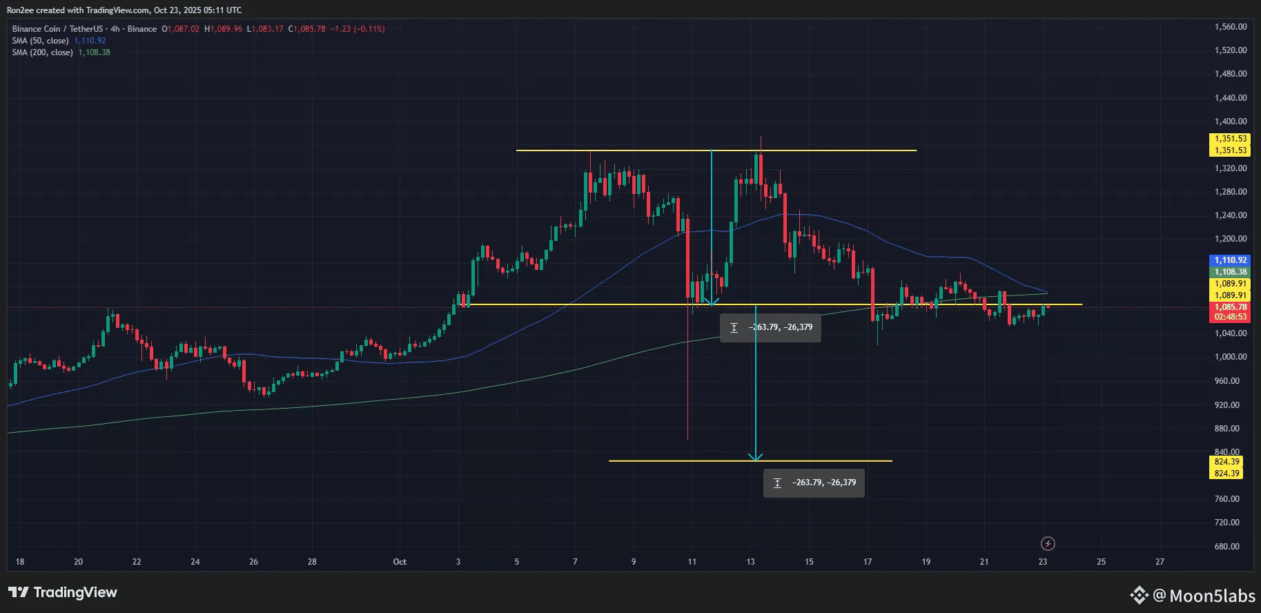 The two peaks formed around $1,351, both showing strong rejection wicks — a classic sign of buyer exhaustion. The neckline sits at $1,087, the current trading level, leaving BNB vulnerable to volatility.