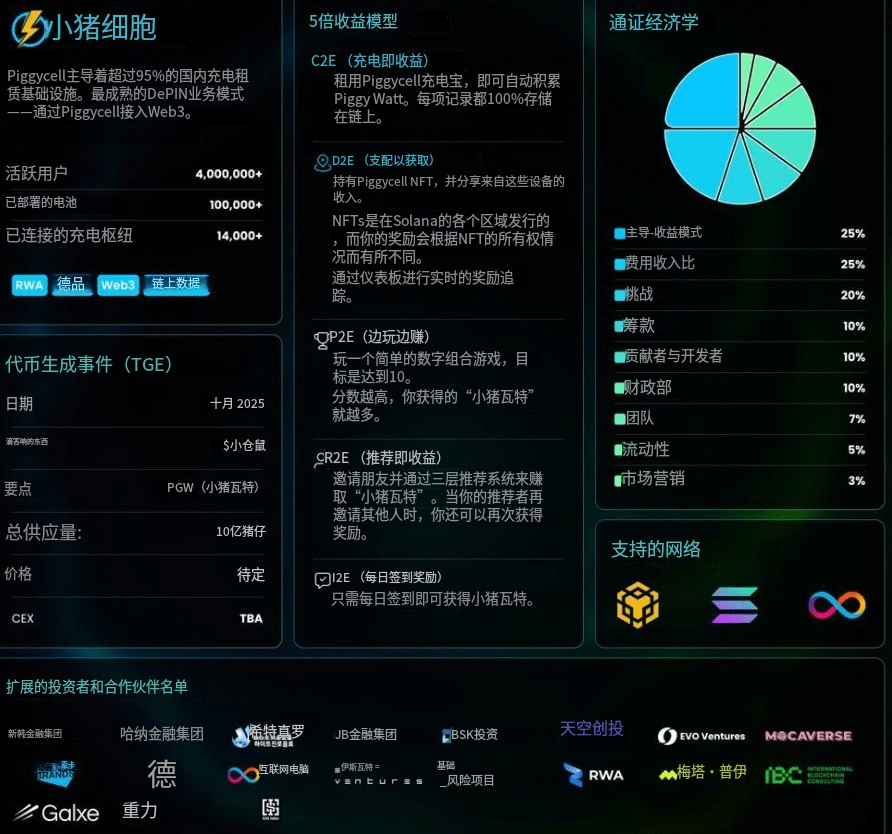 Project Overview: The core goal of Piggycell is to reshape its vast offline shared power bank network through blockchain technology, building a decentralized physical infrastructure network (DePIN). Its core innovation lies in the tokenization of RWA (real-world assets) and NFT asset binding, putting the ownership and revenue rights of physical charging devices on-chain.