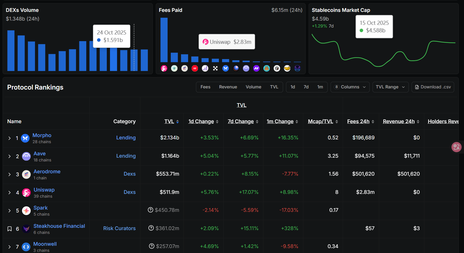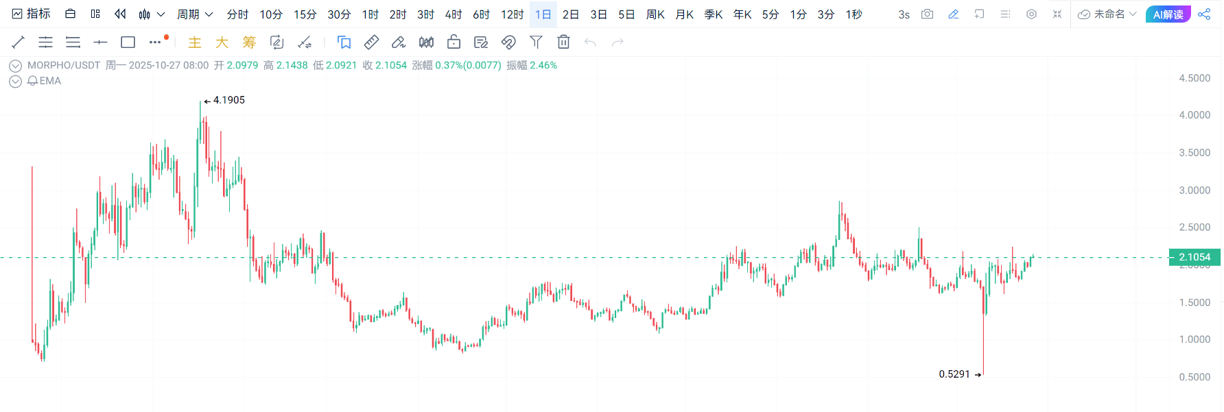 The current market value of the MORPHO token is approximately $1.1 billion, with a fully diluted valuation of about $2.1 billion. The price has risen from the historical low of $0.52 during the extreme market condition of "10.12 Crash" to around $2.11, demonstrating strong market confidence. The main function of the token is governance voting, and there is still further room for improvement in the future value capture mechanism. With the continuous expansion of the protocol's ecosystem and the consolidation of its underlying infrastructure position, the economic value of the token is expected to be further released.