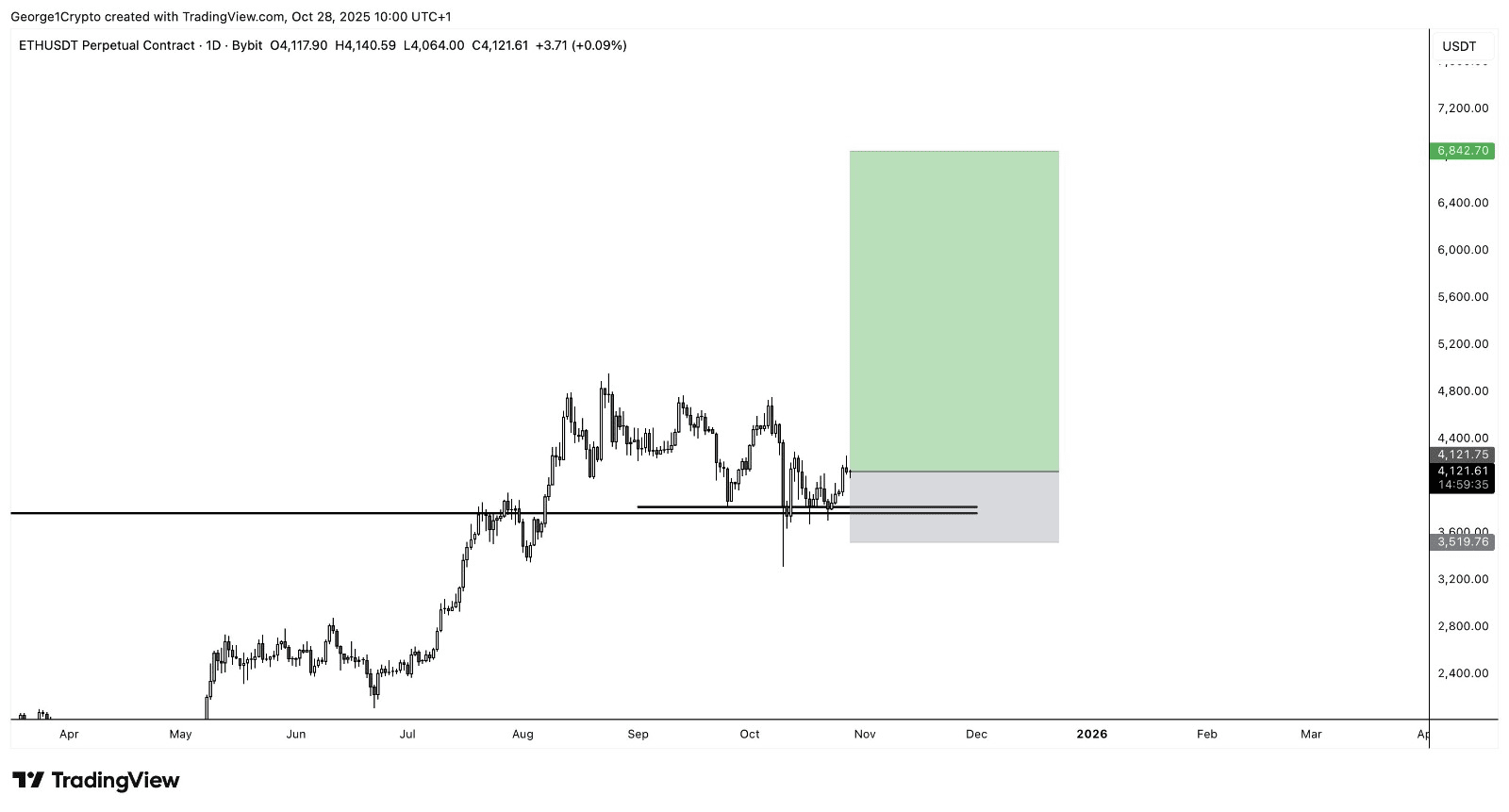 According to their chart, the next target could be between $6,800 and $7,000 - which means a potential gain of about 65–70% from the current levels. However, if ETH slips below $3,500, it would invalidate the bullish setup.