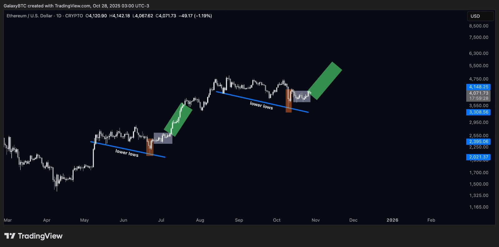 Another analyst from Galaxy says that the current chart of ETH looks similar to the pattern of June-July 2025 - where consistently lower lows were made and then suddenly a bullish breakout occurred.