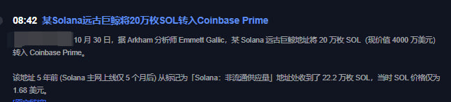 First message: A certain ancient giant whale from Solana dumped 200,000 SOL (worth 40 million dollars) into Coinbase Prime! This guy's cost was only 1.68 dollars five years ago, and now it's 196 dollars, making a huge profit!