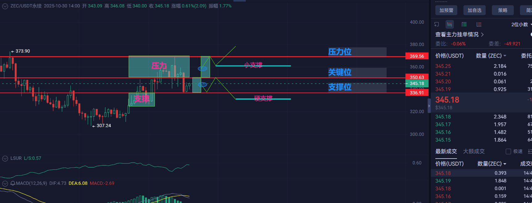 According to the latest hourly candlestick chart, ZEC is currently oscillating around $345. Support levels of $336.91 and around $345 have formed a 'double insurance', while resistance levels of $360 and $369.56 feel like two mountains pressing down. The MACD indicator shows weakening momentum, but trading volume has significantly increased near the support level, indicating that bulls are building strength. If it can break through $360 with volume tonight, it is likely to challenge the 369 resistance; however, if it falls below $345, it may directly test the 330 strong support!