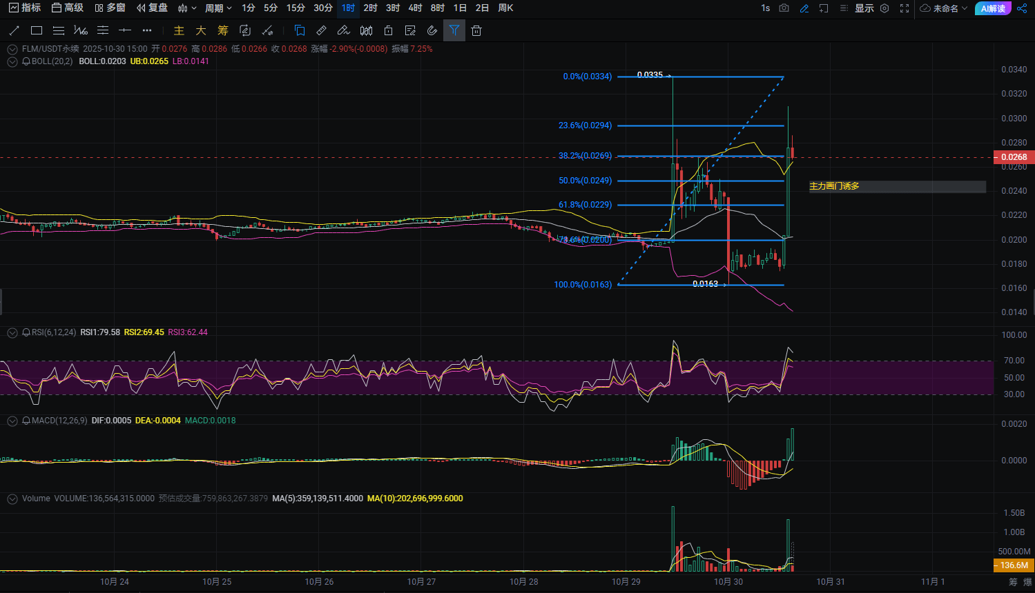 On November 12, Binance will delist the FLM perpetual contract, causing a stir in the crypto world these past few days. Generally, a delisting is a significant negative factor; once liquidity is cut off, the price should drop drastically. However, FLM is not playing by the rules—soaring 40% in three days, from 0.019 to 0.0335 at 11 PM yesterday, directly teasing retail investors' greed. What happened next? The price just touched 0.0335, and by midnight, it plummeted back to 0.0163, leaving a shadow like a 'lightning rod'. This is not an increase; it's clearly the main force drawing a 'death door' on the candlestick chart, just waiting for retail investors to dive in!