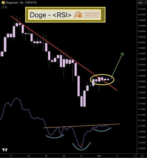 Dogecoin’s price is displaying early signs of recovery as a breakout above its resistance trendline coincides with a bullish inverse head and shoulders pattern on the RSI, suggesting improving market sentiment and potential short-term upside momentum.
