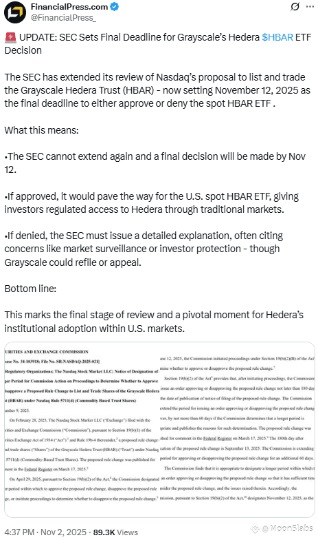 The U.S. Securities and Exchange Commission (SEC) has announced that it will issue a final decision on November 12, 2025, regarding Grayscale’s proposal to launch a spot exchange-traded fund (ETF) for Hedera (HBAR).