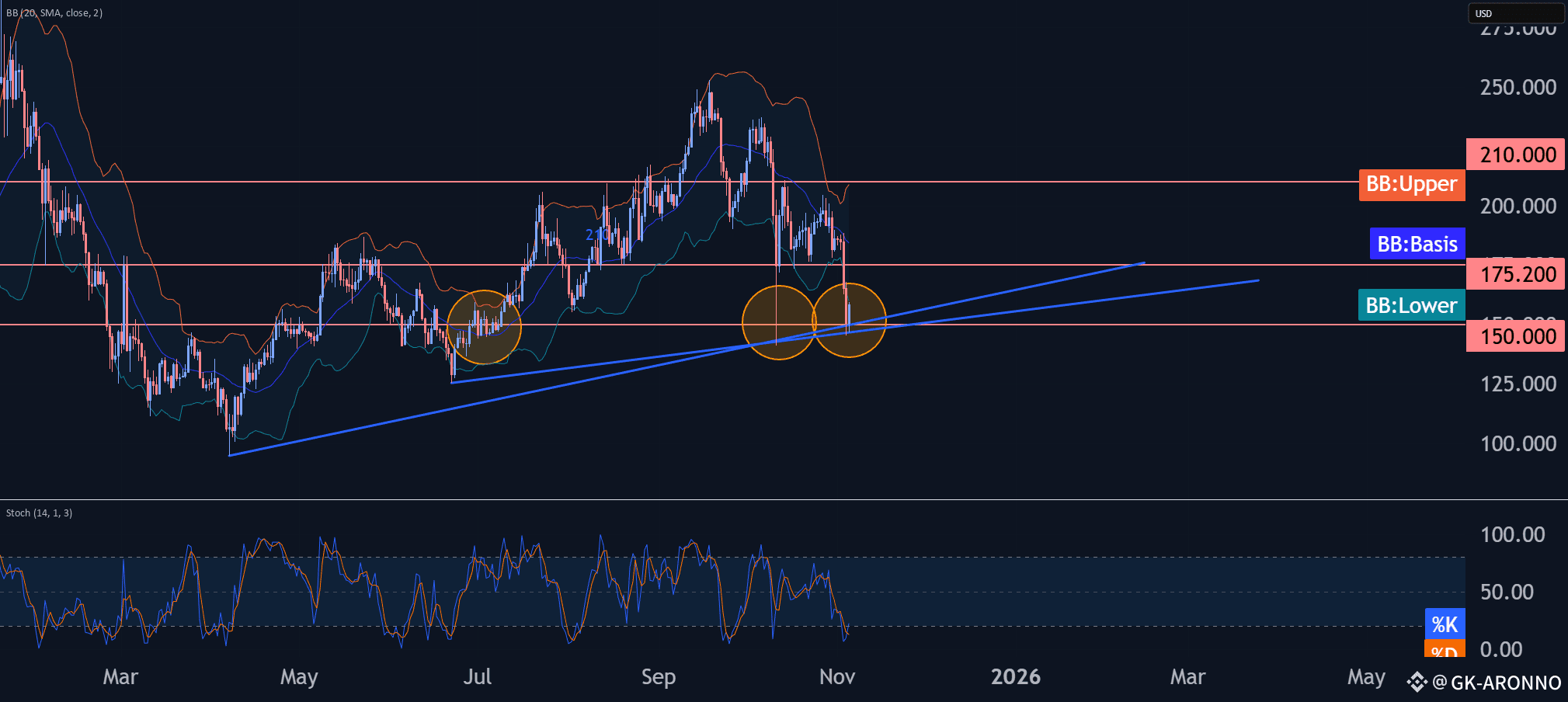 Solana cryptocurrency recently reversed from the support area between the key support level 150.00 (which stopped the previous sharp downward correction (2) at the start of October), lower daily Bollinger Band and the two support trendlines from June and April.