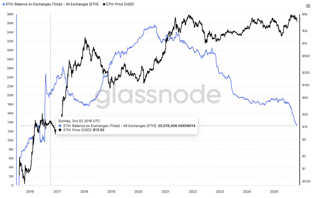 Ethereum's balance on exchanges drops to its lowest level in nine years as capitulation continues.