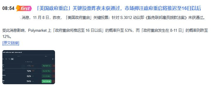 The key vote in the U.S. Senate on the (exemption federal employee funding bill) did not pass! This directly led to the market betting that the probability of a 'government restart being delayed until after the 16th' surged from less than half to 53%! Meanwhile, the originally most likely 'restart on the 8th-11th' probability plummeted to only 12%.