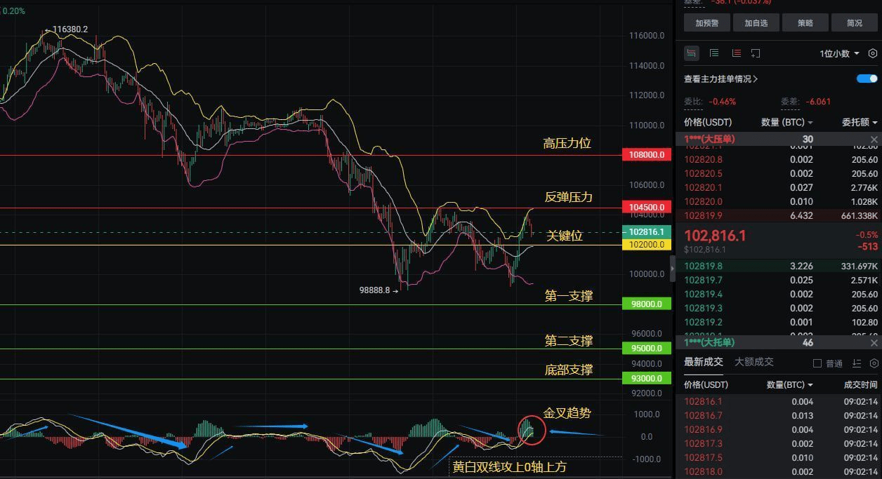 Conservatives: Watching the show with no positions is the best! The market is currently in a tug-of-war with no results; if you go in now, you are just 'chives.' Wait until it either breaks below 98000 to confirm a downtrend or stabilizes above 104500 to break through the resistance before taking action!