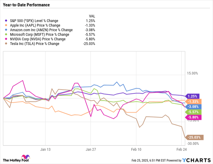 The year-to-date performance chart shows that the US stock market began to slow down in early 2025. Giants like NVIDIA (-5.8%), Microsoft (-5.6%), and Tesla (-25%) plummeted, indicating fatigue after a major rally in 2024. Only the S&P 500 is still holding on slightly at +1.25%, suggesting that the AI euphoria is starting to fade and investors are becoming realistic about overvalued valuations.