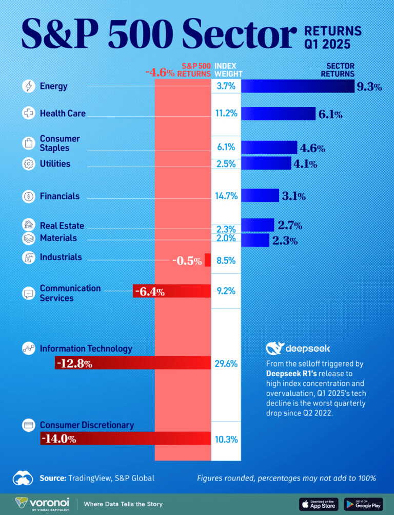 The Information Technology sector leads the decline with -12.8%, followed by Consumer Discretionary at -14%. Interestingly, Energy (+9.3%) and Health Care (+6.1%) are actually leading. This major correction is triggered by concerns overvaluation and the effects of the release of new AI models like DeepSeek R1, which caused investors to reassess the 'bubble' in technology stocks.