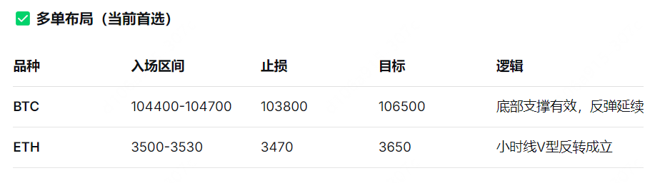 The morning roller coaster has cleared out weak hands, and the current bottom support has been verified three times. Before breaking key support, any pullback is an opportunity to go long, with a focus on whether BTC can break the morning high of 107400 to open new upward space.