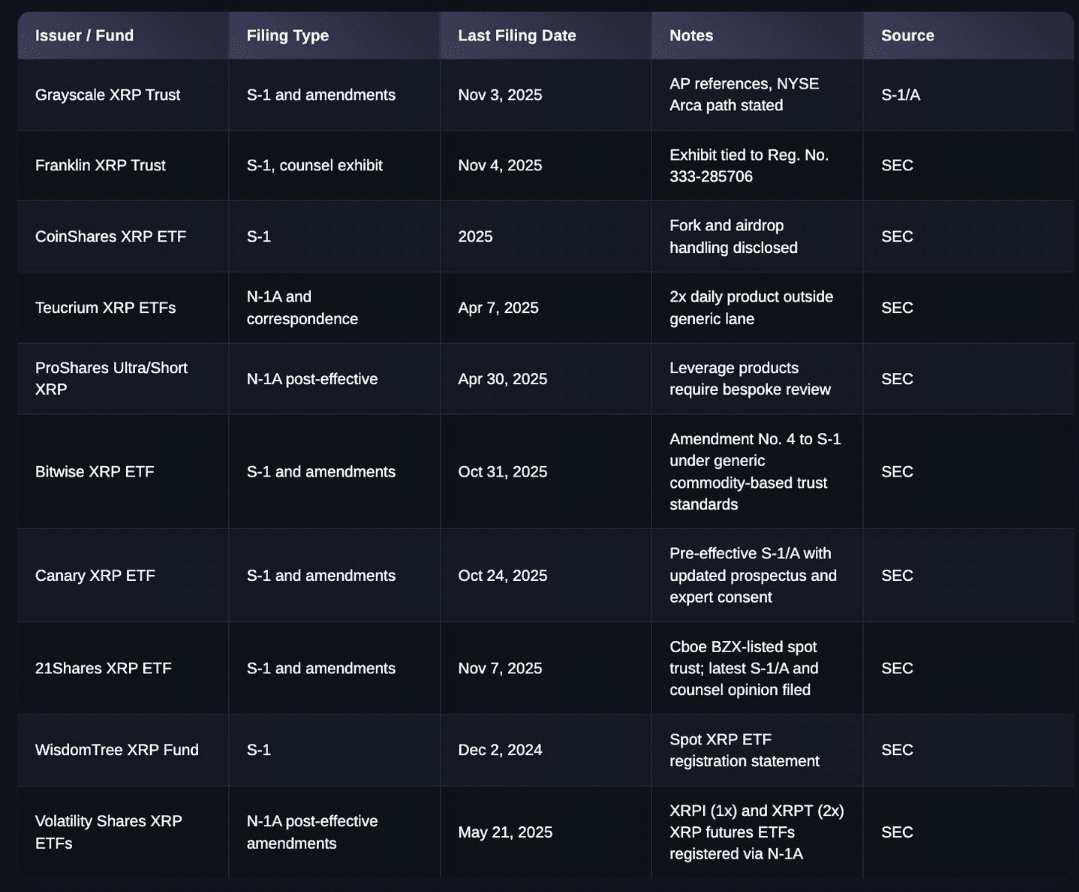 — Grayscale submitted an S-1 for the Grayscale XRP Trust in August, with amendments in October and November indicating NYSE Arca and AP listing mechanisms.