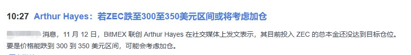 This morning, I came across a post from Arthur Hayes, this guy said: 'If ZEC drops to 300-350 dollars, I might add to my position.' He hasn't met his target position yet!