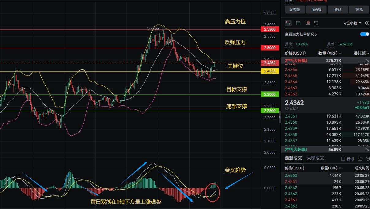 The technical aspect has rebound momentum, and the news aspect has dual catalysts of policy and funds. I believe XRP will first aim for 2.5000 tonight. If the shutdown voting passes and the ETF news develops, it can challenge 2.5800. But remember: 2.4000 is the lifeline! If it falls below this level, it indicates that the main force is luring in more buyers, and you should quickly retreat to the support level of 2.3000!